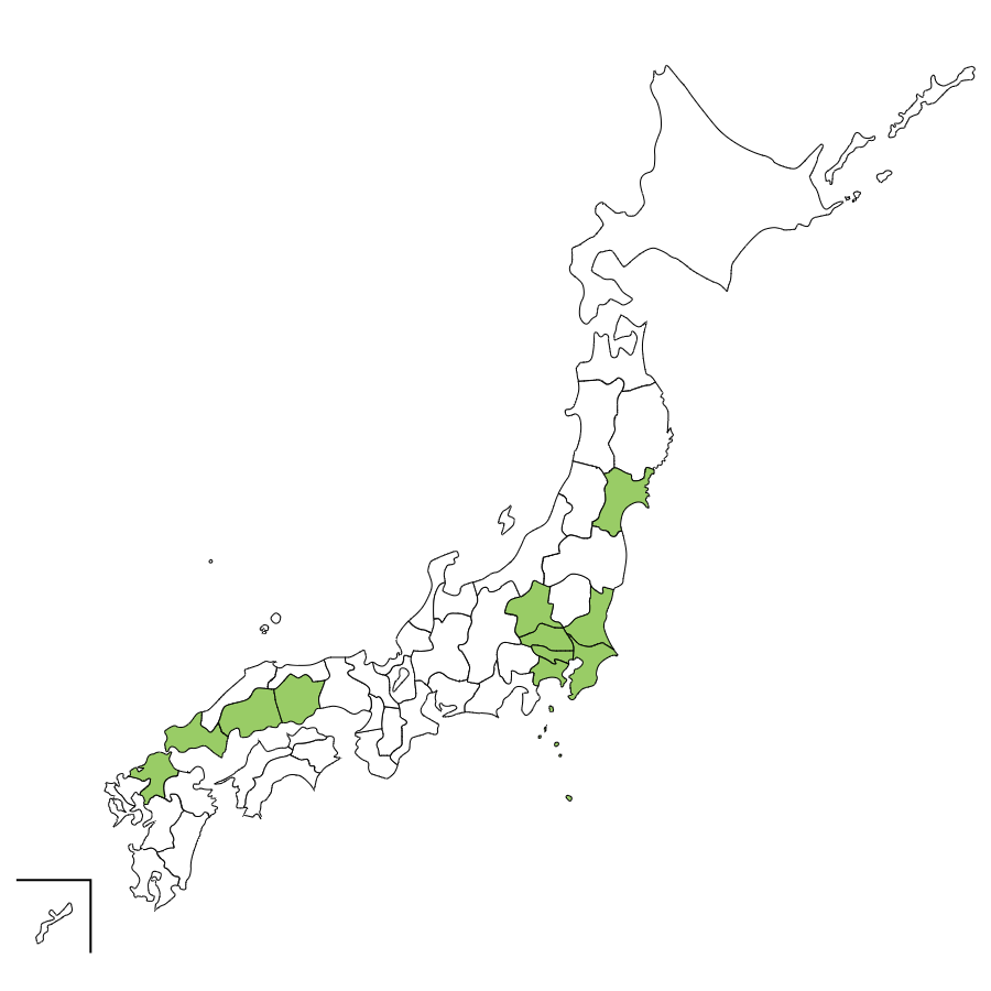 宮城県、茨城県、群馬県、埼玉県、千葉県、東京都、神奈川県、岡山県、広島県、山口県、福岡県