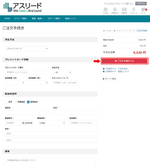 入力をお済ませいただき「ご注文を確定する」ボタンをクリックすると、注文確定します。